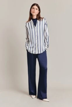 A play on our classic Luna skirt, our Arella navy skirt is cut on the bias in a mini length and crafted in garment-dyed satin so it falls fluidly over the body to create a flattering, form-fitting silhouette. A subtly elasticated waistband ensures comfort. Dress up with a our Jana camisole and heels, or down with a simple tee, denim jacket and trainers – versatility is Arella’s superpower.