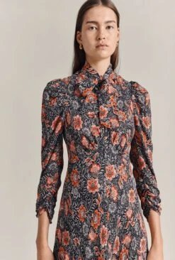 Perfect for autumn, Erin is a midi-length dress crafted from our winter crepe in a gorgeous floral print. Long straight sleeves and voluminous shoulders add volume while the tie neck detail adds on-trend elegance to this must have look.