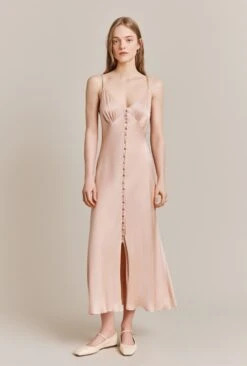 A button-through slip dress with a flattering empire line bust, Jada is crafted from our luxurious heavy satin. With adjustable straps she can be altered to ensure the perfect fit. Midi in length Jada is a summer wardrobe staple you can dress up or down to a number of occasions.