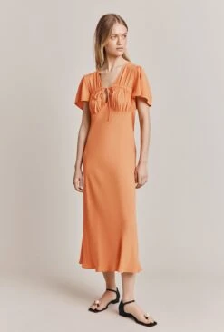 We love Laura, crafted in our classic lightweight crepe. Midi in length with drawstring detail at the bust, she frames the face beautifully. Short, ruffled sleeves and a deep v neckline add a playful touch to this simple yet stylish wardrobe must-have. Laura is perfect for a range of occasions, from a summer garden party to a formal dinner. Dress up with a pair of heels and statement jewellery or dress down with sandals and a denim jacket for a more casual look.