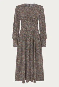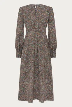 Fresh floral prints are the perfect springtime look. Crafted from cotton stretch in an orange ditsy print, Tabatha has a corseted pin tuck waist that will cinch in your figure beautifully. A fitted style that’s midi in length, the dress also has a round neckline and long sleeves with deep cuffs. The keyhole button at the back makes sure the detail continues and a side zip makes dressing easy. Pair with boots of loafers and layer over a denim jacket.
